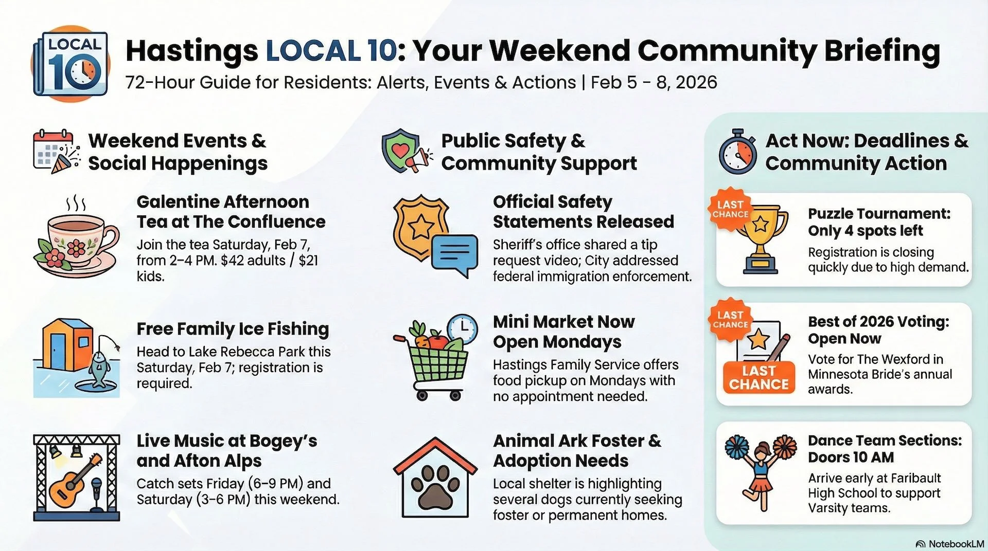 Good morning, Hastings, MN. Here’s your Thursday, February 5th, 2026 briefing—focused on today/tonight and the next 72 hours across Media, Hospitality, Home Pros, and the Latest. If a key detail is missing in the feed export, we flag it so you can confirm on the official post.