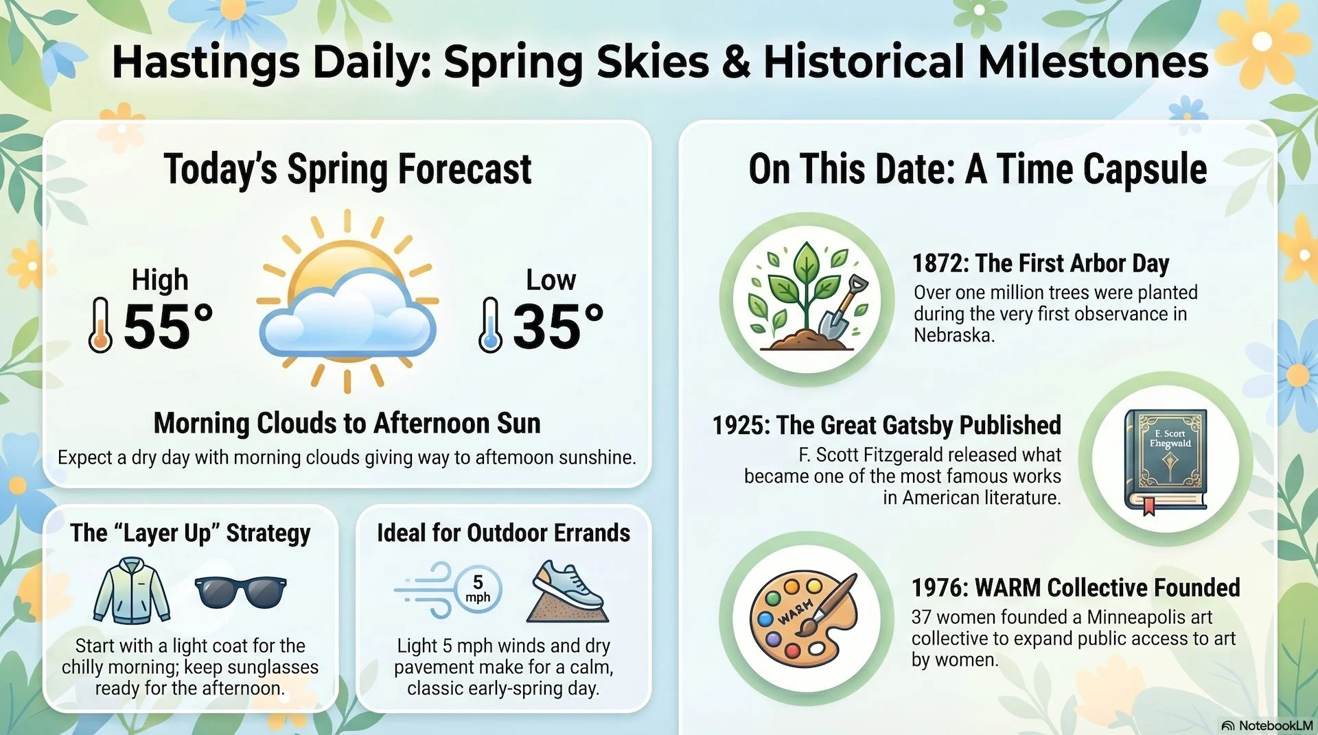 Hastings gets a pretty good Friday deal today: a chilly, cloudy start, then a brighter afternoon with spring finally acting a little more cooperative. Expect a dry day overall, light wind, and a nicer setup for downtown errands, a Levee Park walk, or just staring at the river like it owes you answers.