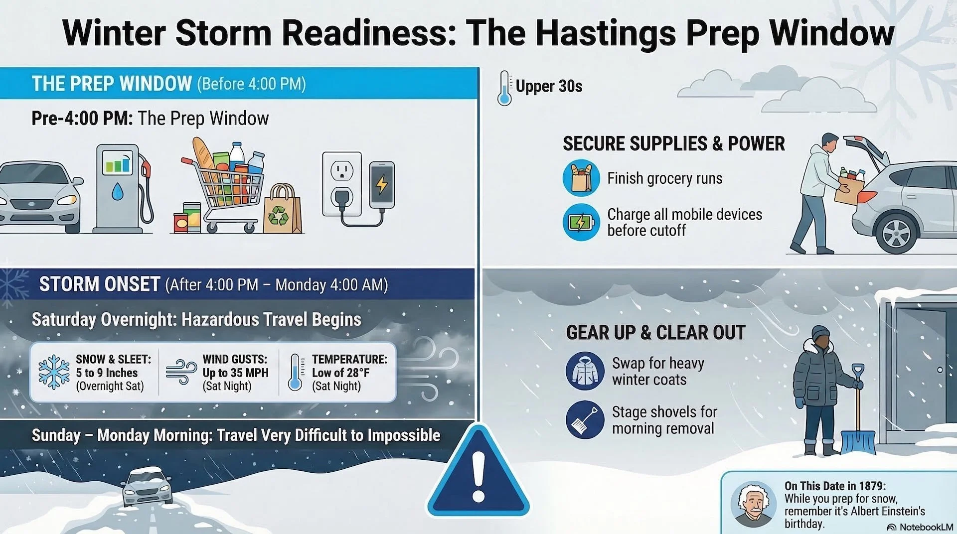 Charge devices and get the shovel, boots, and snow plan ready before evening.